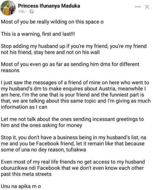 An Austria-based Nigerian woman, Princess Ifunanya Maduka, has taken to Facebook to warn her online friends who slid into her husband’s DM to greet him, beg for money, and other unnecessary reasons.