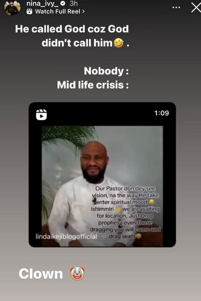 Ex-BBNaija housemate, Nina Ivy has taken a swipe at actor, Yul Edochie, over his new calling as a minister.