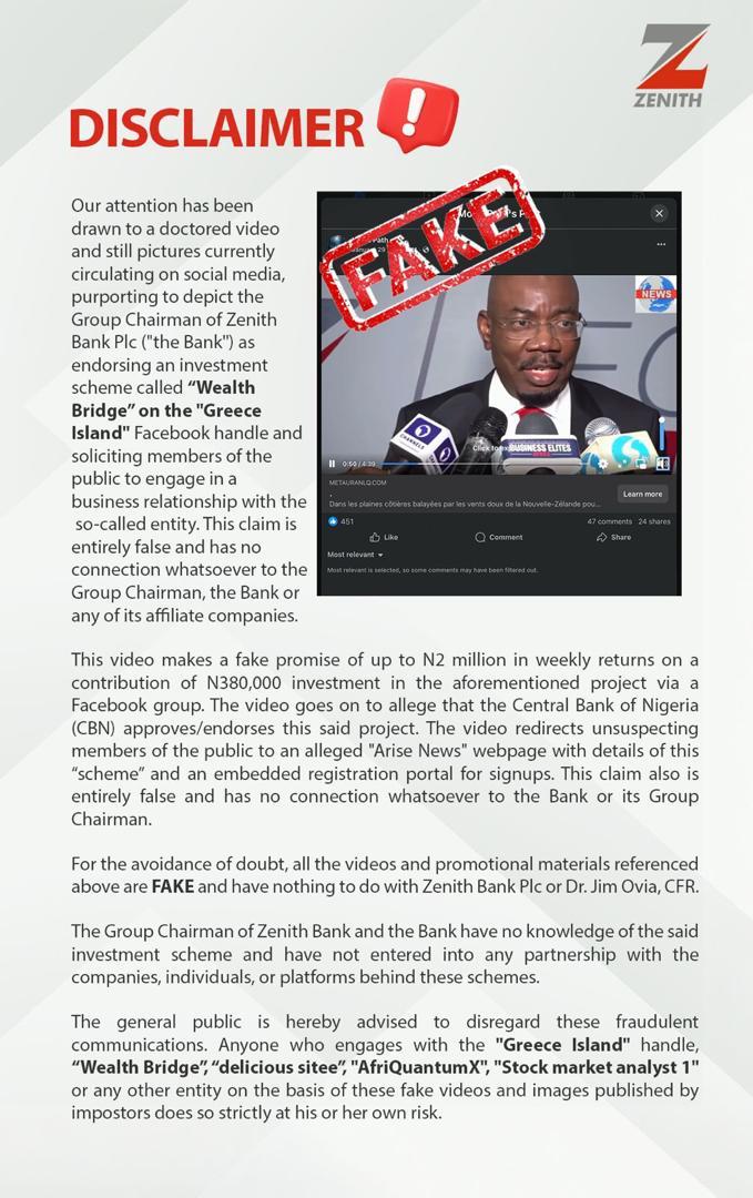 Zenith Bank Plc has advised members of the public to disregard videos circulating online linking the Banks’ Group Chairman, Dr Jim Ovia, as endorsing an investment scheme known as Wealth Bridge.